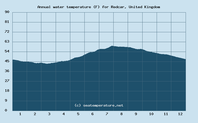 The water temperature in the North Sea in Redcar during the summer ranges from 9°C to 19°C (48°F to 66°F).