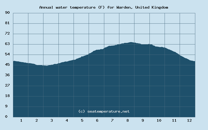 On this page, you will find comprehensive information about the sea temperature in Warden in England, including current readings, historical data and trends, monthly averages, as well as weather forecasts and upcoming temperature predictions. We find every spot where you can swim and tell you what the water temperature is there today and throughout the year.