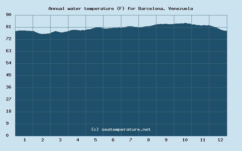 The average annual water temperature in Caribbean Sea in Barcelona is 27°C (81°F). In January, the water reaches its lowest point of the year at 22°C (72°F), while in October, it peaks at 32°C (90°F). The water temperature in the Caribbean Sea in Barcelona is comfortable for beach vacations and swimming year-round.
