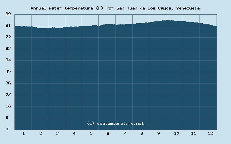Below is the annual chart of sea temperature changes in the Caribbean Sea in San Juan de Los Cayos.