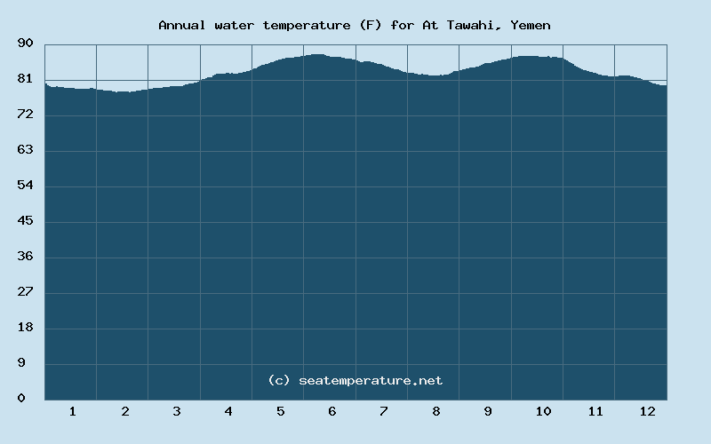 Below is the annual chart of sea temperature changes in the Gulf of Aden in At Tawahi.